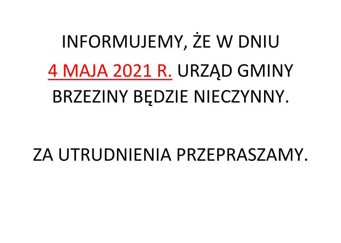 INFORMUJEMY, ŻE W DNIU 4 MAJA 2021 R. URZĄD GMINY BRZEZINY BĘDZIE NIECZYNNY.