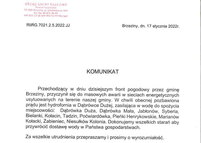 Komunikat Wójta Gminy Brzeziny w sprawie przerw w dostawie wody dla mieszkańców miejscowości na terenie Gminy Brzeziny z dnia 17 stycznia br.